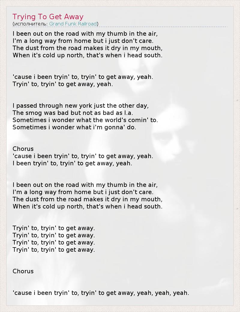 I been out on the road with my thumb in the air, I'm a long way from home but i just don't care. The dust from the road makes it dry in my mouth, When it's cold up north, that's when i head south. 'cause i been tryin' to, tryin' to get away, yeah. Tryin' to, tryin' to get away, yeah. I passed through new york just the other day, The smog was bad but not as bad as l.a. Sometimes i wonder what the world's comin' to. Sometimes i wonder what i'm gonna' do. Chorus 'cause i been tryin' to, tryin' to get away, yeah. I been tryin' to, tryin' to get away, yeah. I been out on the road with my thumb in the air, I'm a long way from home but i just don't care. The dust from the road makes it dry in my mouth, When it's cold up north, that's when i head south. Tryin' to, tryin' to get away. Tryin' to, tryin' to get away. Tryin' to, tryin' to get away. Tryin' to, tryin' to get away. Chorus 'cause i been tryin' to, tryin' to get away, yeah, yeah, yeah.