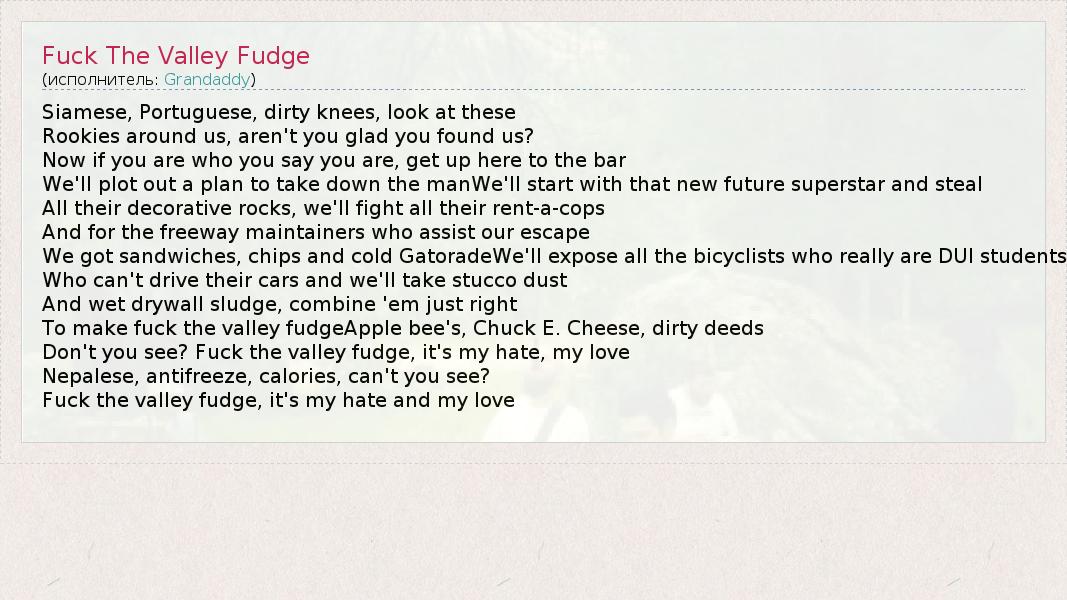 А как ты думаешь, о чем песня "Fuck The Valley Fudge" ?