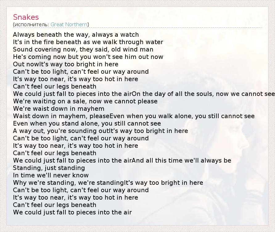Always beneath the way, always a watch It's in the fire beneath as we walk through water Sound covering now, they said, old wind man He's coming now but you won't see him out now Out nowIt's way too bright in here Can't be too light, can't feel our way around It's way too near, it's way too hot in here Can't feel our legs beneath We could just fall to pieces into the airOn the day of all the souls, now we cannot see We're waiting on a sale, now we cannot please We're waist down in mayhem Waist down in mayhem, pleaseEven when you walk alone, you still cannot see Even when you stand alone, you still cannot see A way out, you're sounding outIt's way too bright in here Can't be too light, can't feel our way around It's way too near, it's way too hot in here Can't feel our legs beneath We could just fall to pieces into the airAnd all this time we'll always be Standing, just standing In time we'll never know Why we're standing, we're standingIt's way too bright in here Can't be too light, can't feel our way around It's way too near, it's way too hot in here Can't feel our legs beneath We could just fall to pieces into the air