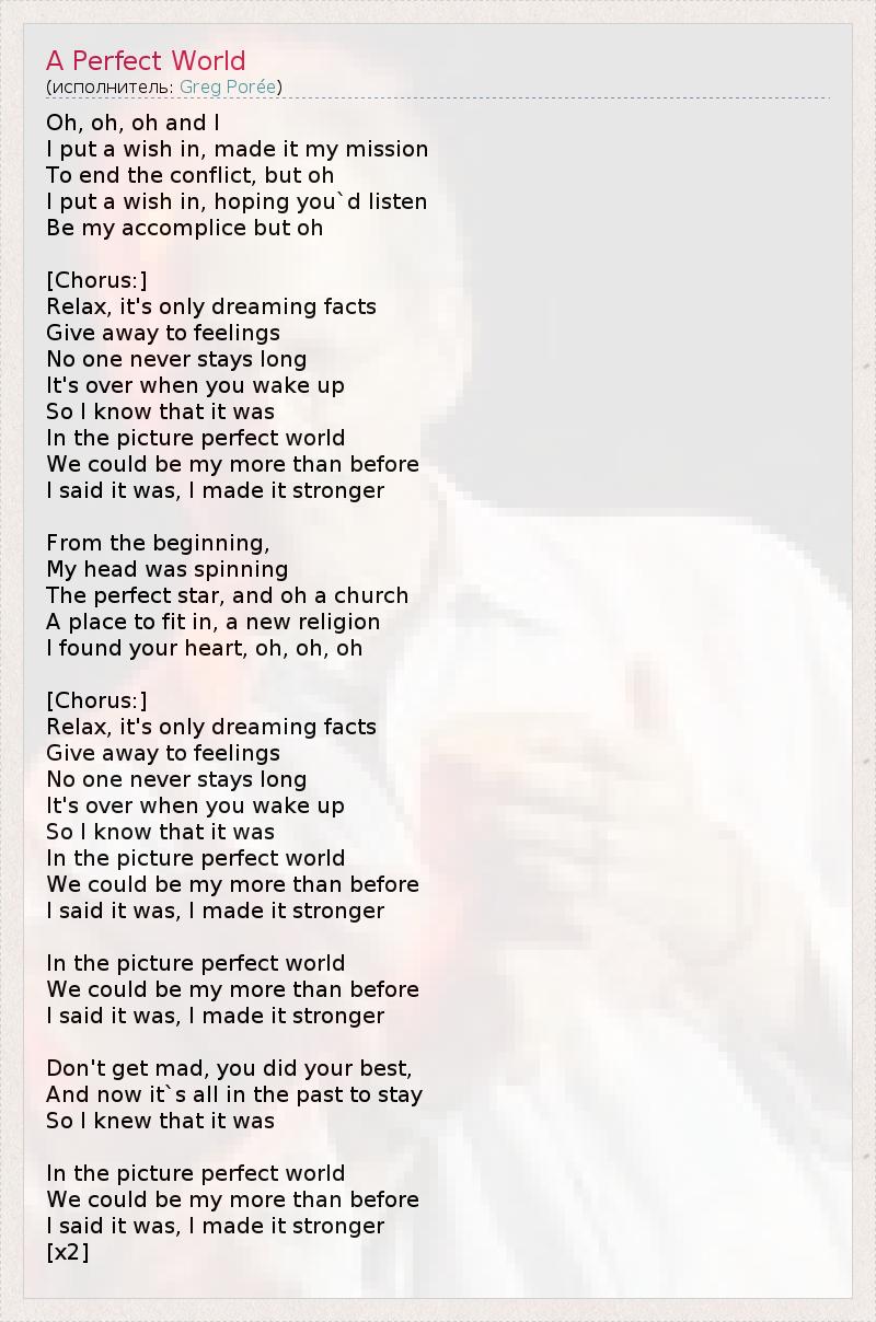 Oh, oh, oh and I I put a wish in, made it my mission To end the conflict, but oh I put a wish in, hoping you`d listen Be my accomplice but oh [Chorus:] Relax, it's only dreaming facts Give away to feelings No one never stays long It's over when you wake up So I know that it was In the picture perfect world We could be my more than before I said it was, I made it stronger From the beginning, My head was spinning The perfect star, and oh a church A place to fit in, a new religion I found your heart, oh, oh, oh [Chorus:] Relax, it's only dreaming facts Give away to feelings No one never stays long It's over when you wake up So I know that it was In the picture perfect world We could be my more than before I said it was, I made it stronger In the picture perfect world We could be my more than before I said it was, I made it stronger Don't get mad, you did your best, And now it`s all in the past to stay So I knew that it was In the picture perfect world We could be my more than before I said it was, I made it stronger [x2]