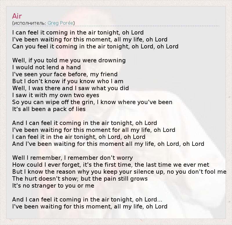 I can feel it coming in the air tonight, oh Lord I've been waiting for this moment, all my life, oh Lord Can you feel it coming in the air tonight, oh Lord, oh Lord Well, if you told me you were drowning I would not lend a hand I've seen your face before, my friend But I don't know if you know who I am Well, I was there and I saw what you did I saw it with my own two eyes So you can wipe off the grin, I know where you've been It's all been a pack of lies And I can feel it coming in the air tonight, oh Lord I've been waiting for this moment for all my life, oh Lord I can feel it in the air tonight, oh Lord, oh Lord And I've been waiting for this moment all my life, oh Lord, oh Lord Well I remember, I remember don't worry How could I ever forget, it's the first time, the last time we ever met But I know the reason why you keep your silence up, no you don't fool me The hurt doesn't show; but the pain still grows It's no stranger to you or me And I can feel it coming in the air tonight, oh Lord... I've been waiting for this moment, all my life, oh Lord