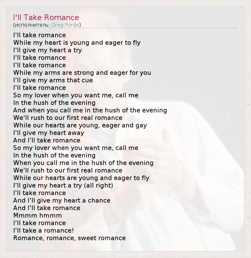 I'll take romance While my heart is young and eager to fly I'll give my heart a try I'll take romance I'll take romance While my arms are strong and eager for you I'll give my arms that cue I'll take romance So my lover when you want me, call me In the hush of the evening And when you call me in the hush of the evening We'll rush to our first real romance While our hearts are young, eager and gay I'll give my heart away And I'll take romance So my lover when you want me, call me In the hush of the evening When you call me in the hush of the evening We'll rush to our first real romance While our hearts are young and eager to fly I'll give my heart a try (all right) I'll take romance And I'll give my heart a chance And I'll take romance Mmmm hmmm I'll take romance I'll take a romance! Romance, romance, sweet romance