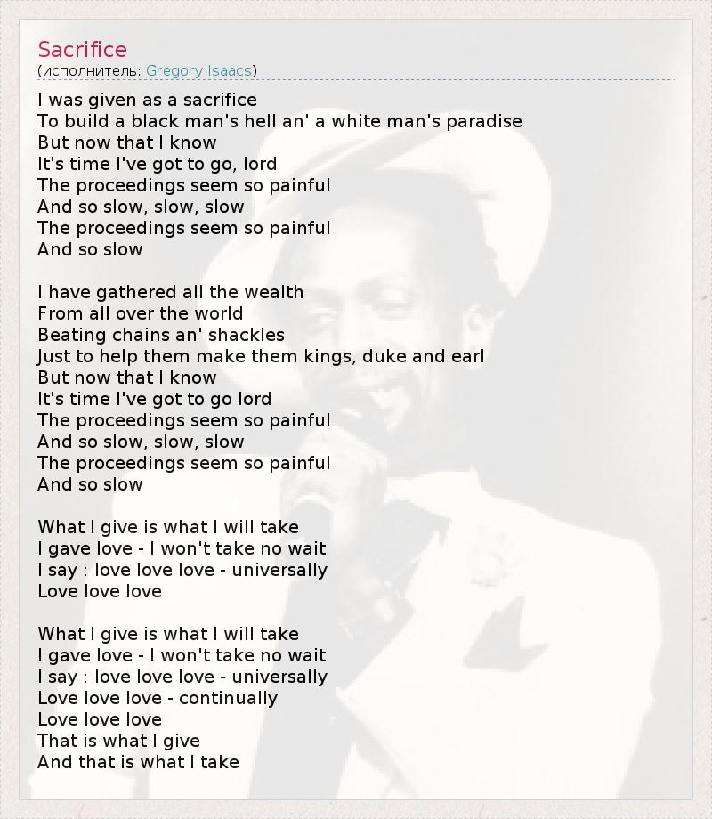 I was given as a sacrifice To build a black man's hell an' a white man's paradise But now that I know It's time I've got to go, lord The proceedings seem so painful And so slow, slow, slow The proceedings seem so painful And so slow I have gathered all the wealth From all over the world Beating chains an' shackles Just to help them make them kings, duke and earl But now that I know It's time I've got to go lord The proceedings seem so painful And so slow, slow, slow The proceedings seem so painful And so slow What I give is what I will take I gave love - I won't take no wait I say : love love love - universally Love love love What I give is what I will take I gave love - I won't take no wait I say : love love love - universally Love love love - continually Love love love That is what I give And that is what I take