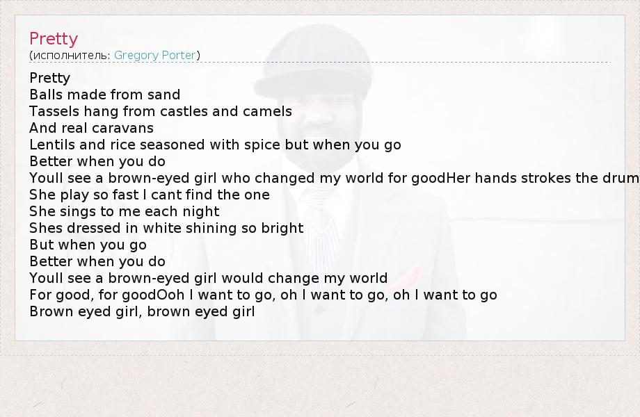Это интересно:«Голос Портера это чудо: теплый, убедительный тенор с точными, безупречными интонациями полностью соответствует оригиналам, чтобы – как всякий хороший джаз – погрузиться в ощущение бесконечного знакомства», – так характеризует вокал Грегори Портера BBC Review (2012). Его фирменный стиль легко узнаваем: классический элегантный костюм в сопровождении неизменной шапки и шарфа, плотно обмотанного... продолжение