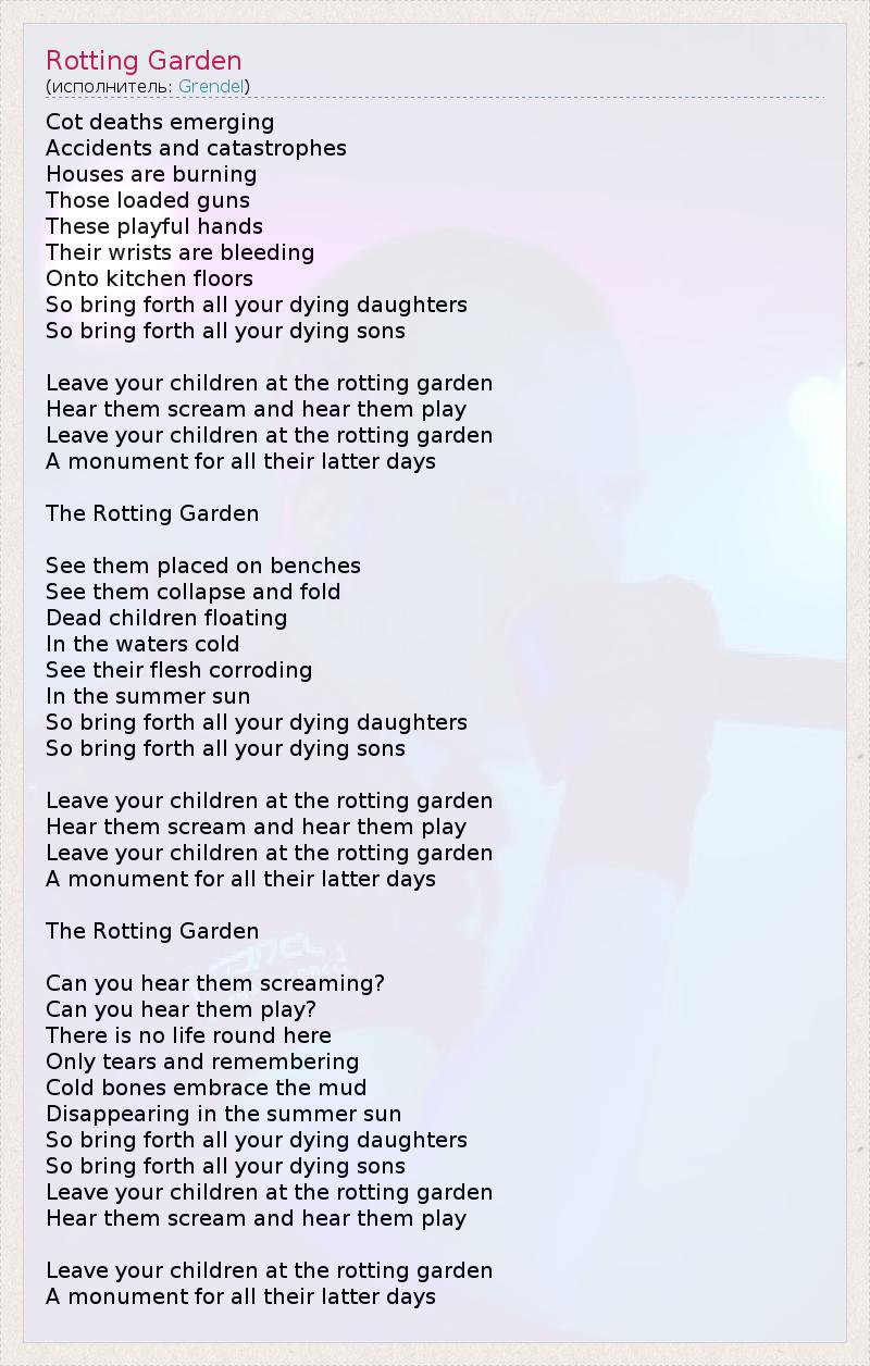 Детская кроватка смерти возникающие Аварии и катастрофы Дома горят Эти загруженные пушки Эти шаловливые ручки Их запястья кровотечение Onto кухонных полов Так приносить все ваши умирающих дочерей Так приносить все ваши сыновья умирающих Оставьте ваши дети в гниющей саду Слушайте , как они кричат и услышать их играть Оставьте ваши дети в гниющей саду Памятник для всех своих последних дней Гниющий Сад Увидеть их помещают на скамейках Увидеть их свернуть и сложить Мертвые дети , плавающие В водах холодных Смотреть их плоть коррозии В летнее солнце Так приносить все ваши умирающих дочерей Так приносить все ваши сыновья умирающих Оставьте ваши дети в гниющей саду Слушайте , как они кричат и услышать их играть Оставьте ваши дети в гниющей саду Памятник для всех своих последних дней Гниющий Сад Слышишь их крики ? Слышишь , как они играют ? Там нет жизни круглый здесь Только слезы и запоминание Холодные кости обнять грязь Исчезающие на летнем солнце Так приносить все ваши умирающих дочерей Так приносить все ваши сыновья умирающих Оставьте ваши дети в гниющей саду Слушайте , как они кричат и услышать их играть Оставьте ваши дети в гниющей саду Памятник для всех своих последних дней