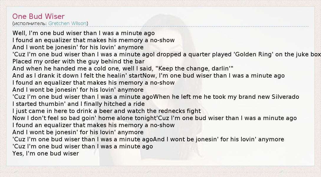 Well, I'm one bud wiser than I was a minute ago I found an equalizer that makes his memory a no-show And I wont be jonesin' for his lovin' anymore 'Cuz I'm one bud wiser than I was a minute agoI dropped a quarter played 'Golden Ring' on the juke box Placed my order with the guy behind the bar And when he handed me a cold one, well I said, "Keep the change, darlin'" And as I drank it down I felt the healin' startNow, I'm one bud wiser than I was a minute ago I found an equalizer that makes his memory a no-show And I wont be jonesin' for his lovin' anymore 'Cuz I'm one bud wiser than I was a minute agoWhen he left me he took my brand new Silverado I started thumbin' and I finally hitched a ride I just came in here to drink a beer and watch the rednecks fight Now I don't feel so bad goin' home alone tonight'Cuz I'm one bud wiser than I was a minute ago I found an equalizer that makes his memory a no-show And I wont be jonesin' for his lovin' anymore 'Cuz I'm one bud wiser than I was a minute agoAnd I wont be jonesin' for his lovin' anymore 'Cuz I'm one bud wiser than I was a minute ago Yes, I'm one bud wiser