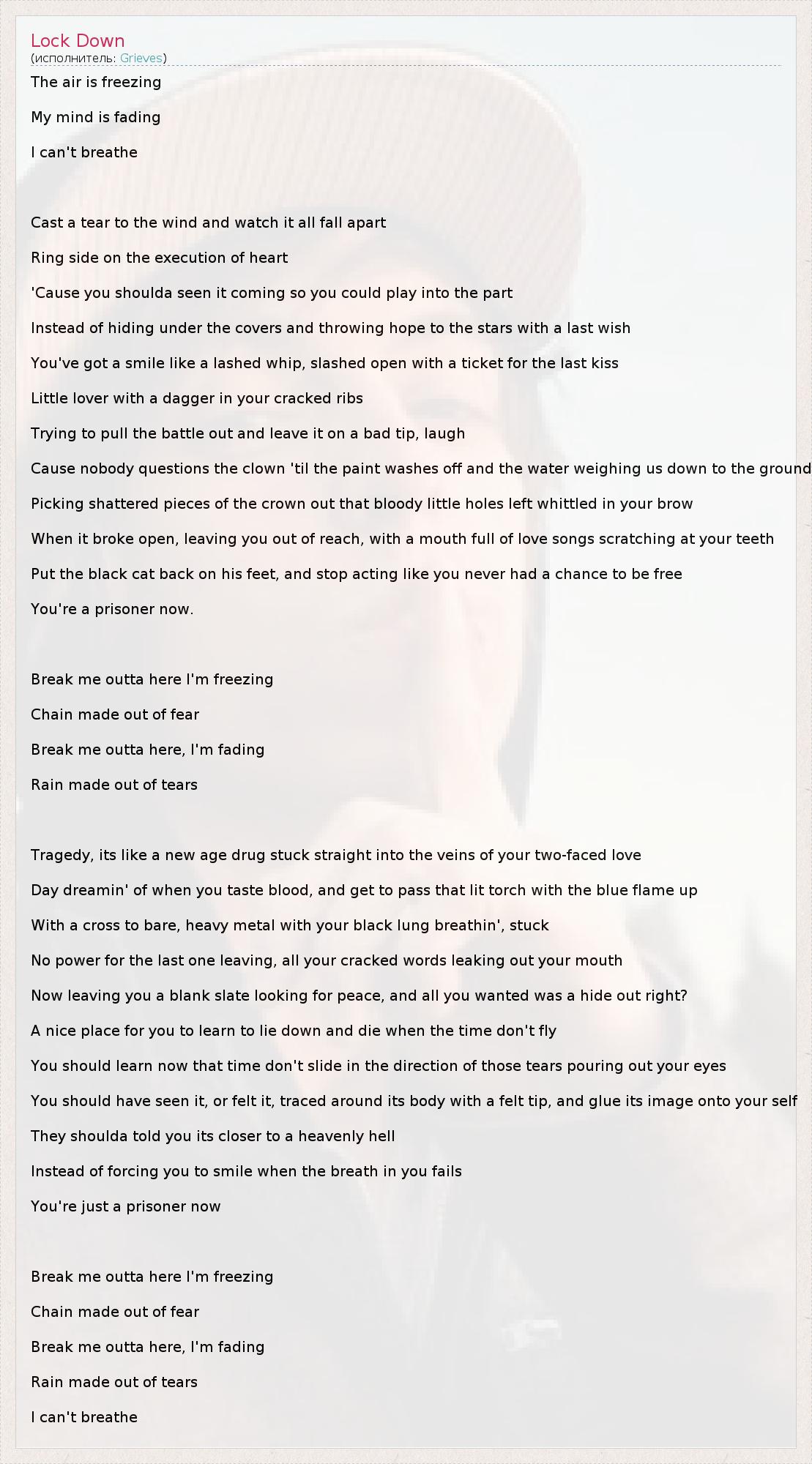 The air is freezing My mind is fading I can't breathe Cast a tear to the wind and watch it all fall apart Ring side on the execution of heart 'Cause you shoulda seen it coming so you could play into the part Instead of hiding under the covers and throwing hope to the stars with a last wish You've got a smile like a lashed whip, slashed open with a ticket for the last kiss Little lover with a dagger in your cracked ribs Trying to pull the battle out and leave it on a bad tip, laugh Cause nobody questions the clown 'til the paint washes off and the water weighing us down to the ground Picking shattered pieces of the crown out that bloody little holes left whittled in your brow When it broke open, leaving you out of reach, with a mouth full of love songs scratching at your teeth Put the black cat back on his feet, and stop acting like you never had a chance to be free You're a prisoner now. Break me outta here I'm freezing Chain made out of fear Break me outta here, I'm fading Rain made out of tears Tragedy, its like a new age drug stuck straight into the veins of your two-faced love Day dreamin' of when you taste blood, and get to pass that lit torch with the blue flame up With a cross to bare, heavy metal with your black lung breathin', stuck No power for the last one leaving, all your cracked words leaking out your mouth Now leaving you a blank slate looking for peace, and all you wanted was a hide out right? A nice place for you to learn to lie down and die when the time don't fly You should learn now that time don't slide in the direction of those tears pouring out your eyes You should have seen it, or felt it, traced around its body with a felt tip, and glue its image onto your self They shoulda told you its closer to a heavenly hell Instead of forcing you to smile when the breath in you fails You're just a prisoner now Break me outta here I'm freezing Chain made out of fear Break me outta here, I'm fading Rain made out of tears I can't breathe