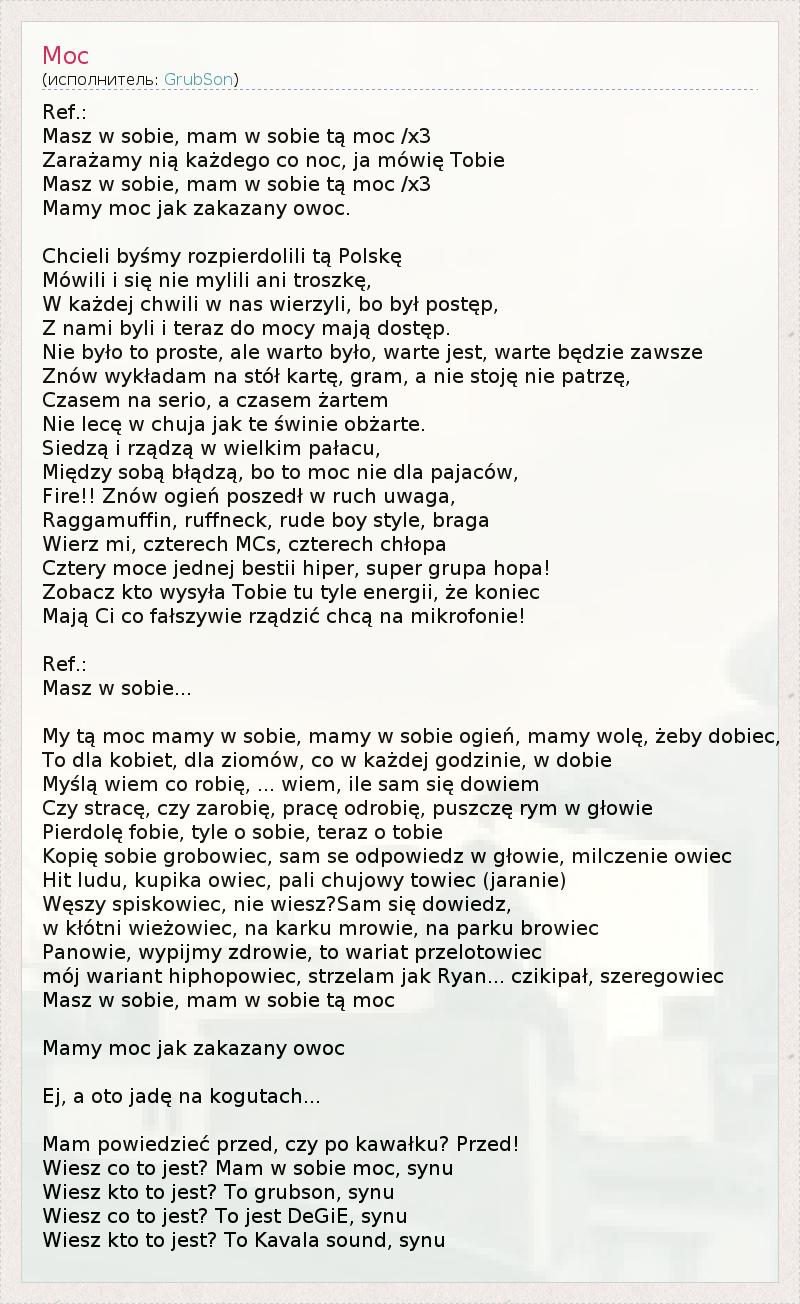 Ref.: Masz w sobie, mam w sobie tą moc /x3 Zarażamy nią każdego co noc, ja mówię Tobie Masz w sobie, mam w sobie tą moc /x3 Mamy moc jak zakazany owoc. Chcieli byśmy rozpierdolili tą Polskę Mówili i się nie mylili ani troszkę, W każdej chwili w nas wierzyli, bo był postęp, Z nami byli i teraz do mocy mają dostęp. Nie było to proste, ale warto było, warte jest, warte będzie zawsze Znów wykładam na stół kartę, gram, a nie stoję nie patrzę, Czasem na serio, a czasem żartem Nie lecę w chuja jak te świnie obżarte. Siedzą i rządzą w wielkim pałacu, Między sobą błądzą, bo to moc nie dla pajaców, Fire!! Znów ogień poszedł w ruch uwaga, Raggamuffin, ruffneck, rude boy style, braga Wierz mi, czterech MCs, czterech chłopa Cztery moce jednej bestii hiper, super grupa hopa! Zobacz kto wysyła Tobie tu tyle energii, że koniec Mają Ci co fałszywie rządzić chcą na mikrofonie! Ref.: Masz w sobie... My tą moc mamy w sobie, mamy w sobie ogień, mamy wolę, żeby dobiec, To dla kobiet, dla ziomów, co w każdej godzinie, w dobie Myślą wiem co robię, ... wiem, ile sam się dowiem Czy stracę, czy zarobię, pracę odrobię, puszczę rym w głowie Pierdolę fobie, tyle o sobie, teraz o tobie Kopię sobie grobowiec, sam se odpowiedz w głowie, milczenie owiec Hit ludu, kupika owiec, pali chujowy towiec (jaranie) Węszy spiskowiec, nie wiesz?Sam się dowiedz, w kłótni wieżowiec, na karku mrowie, na parku browiec Panowie, wypijmy zdrowie, to wariat przelotowiec mój wariant hiphopowiec, strzelam jak Ryan... czikipał, szeregowiec Masz w sobie, mam w sobie tą moc Mamy moc jak zakazany owoc Ej, a oto jadę na kogutach... Mam powiedzieć przed, czy po kawałku? Przed! Wiesz co to jest? Mam w sobie moc, synu Wiesz kto to jest? To grubson, synu Wiesz co to jest? To jest DeGiE, synu Wiesz kto to jest? To Kavala sound, synu