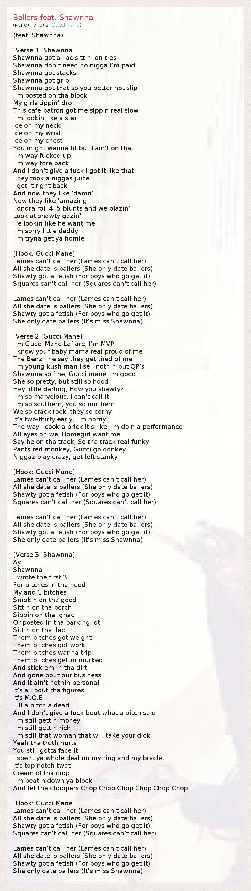 (feat. Shawnna) [Verse 1: Shawnna] Shawnna got a 'lac sittin' on tres Shawnna don't need no nigga I'm paid Shawnna got stacks Shawnna got grip Shawnna got that so you better not slip I'm posted on tha block My girls tippin' dro This cafe patron got me sippin real slow I'm lookin like a star Ice on my neck Ice on my wrist Ice on my chest You might wanna fit but I ain't on that I'm way fucked up I'm way tore back And I don't give a fuck I got it like that They took a niggas juice I got it right back And now they like 'damn' Now they like 'amazing' Tondra roll 4, 5 blunts and we blazin' Look at shawty gazin' He lookin like he want me I'm sorry little daddy I'm tryna get ya homie [Hook: Gucci Mane] Lames can't call her (Lames can't call her) All she date is ballers (She only date ballers) Shawty got a fetish (For boys who go get it) Squares can't call her (Squares can't call her) Lames can't call her (Lames can't call her) All she date is ballers (She only date ballers) Shawty got a fetish (For boys who go get it) She only date ballers (It's miss Shawnna) [Verse 2: Gucci Mane] I'm Gucci Mane Laflare, I'm MVP I know your baby mama real proud of me The Benz line say they get tired of me I'm young kush man I sell nothin but QP's Shawnna so fine, Gucci mane I'm good She so pretty, but still so hood Hey little darling, How you shawty? I'm so marvelous, I can't call it I'm so southern, you so northern We so crack rock, they so corny It's two-thirty early, I'm horny The way I cook a brick It's like I'm doin a performance All eyes on we, Homegirl want me Say he on tha track, So tha track real funky Pants red monkey, Gucci go donkey Niggaz play crazy, get left stanky [Hook: Gucci Mane] Lames can't call her (Lames can't call her) All she date is ballers (She only date ballers) Shawty got a fetish (For boys who go get it) Squares can't call her (Squares can't call her) Lames can't call her (Lames can't call her) All she date is ballers (She only date ballers) Shawty got a fetish (For boys who go get it) She only date ballers (It's miss Shawnna) [Verse 3: Shawnna] Ay Shawnna I wrote the first 3 For bitches in tha hood My and 1 bitches Smokin on tha good Sittin on tha porch Sippin on tha 'gnac Or posted in tha parking lot Sittin on tha 'lac Them bitches got weight Them bitches got work Them bitches wanna trip Them bitches gettin murked And stick em in tha dirt And gone bout our business And it ain't nothin personal It's all bout tha figures It's M.O.E Till a bitch a dead And I don't give a fuck bout what a bitch said I'm still gettin money I'm still gettin rich I'm still that woman that will take your dick Yeah tha truth hurts You still gotta face it I spent ya whole deal on my ring and my braclet It's top notch twat Cream of tha crop I'm beatin down ya block And let the choppers Chop Chop Chop Chop Chop Chop [Hook: Gucci Mane] Lames can't call her (Lames can't call her) All she date is ballers (She only date ballers) Shawty got a fetish (For boys who go get it) Squares can't call her (Squares can't call her) Lames can't call her (Lames can't call her) All she date is ballers (She only date ballers) Shawty got a fetish (For boys who go get it) She only date ballers (It's miss Shawnna)