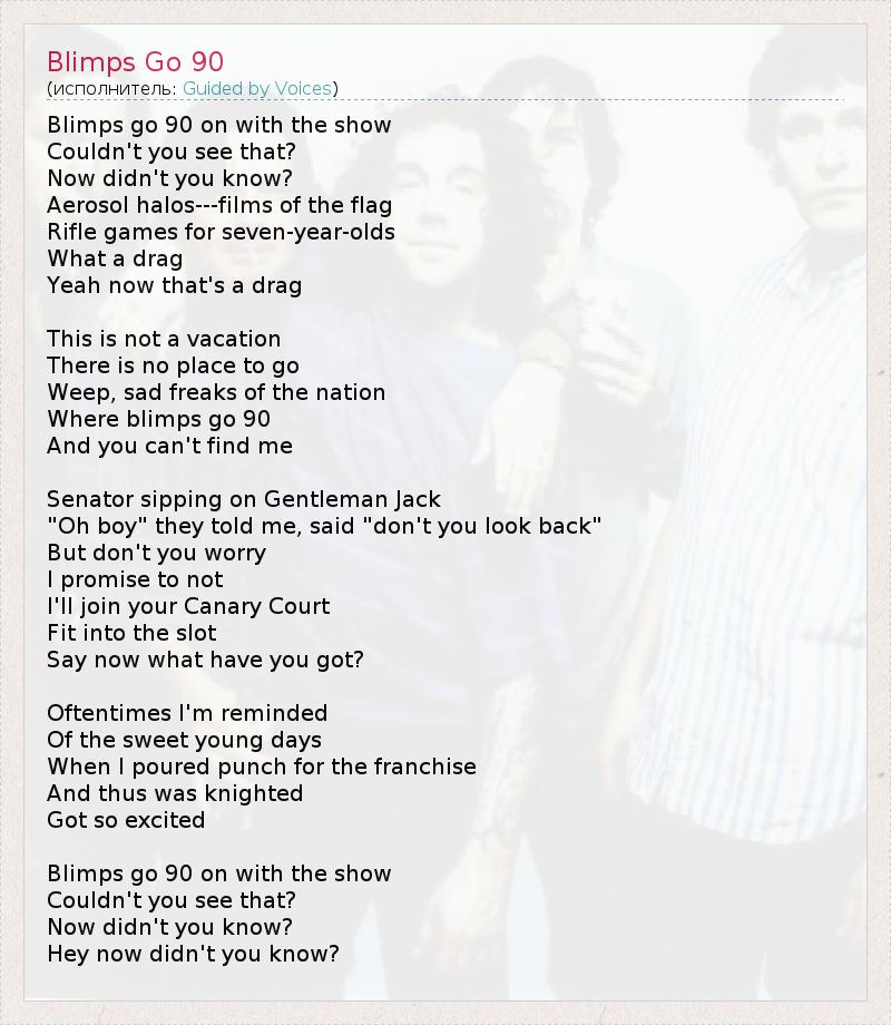 Blimps go 90 on with the show Couldn't you see that? Now didn't you know? Aerosol halos---films of the flag Rifle games for seven-year-olds What a drag Yeah now that's a drag This is not a vacation There is no place to go Weep, sad freaks of the nation Where blimps go 90 And you can't find me Senator sipping on Gentleman Jack "Oh boy" they told me, said "don't you look back" But don't you worry I promise to not I'll join your Canary Court Fit into the slot Say now what have you got? Oftentimes I'm reminded Of the sweet young days When I poured punch for the franchise And thus was knighted Got so excited Blimps go 90 on with the show Couldn't you see that? Now didn't you know? Hey now didn't you know?