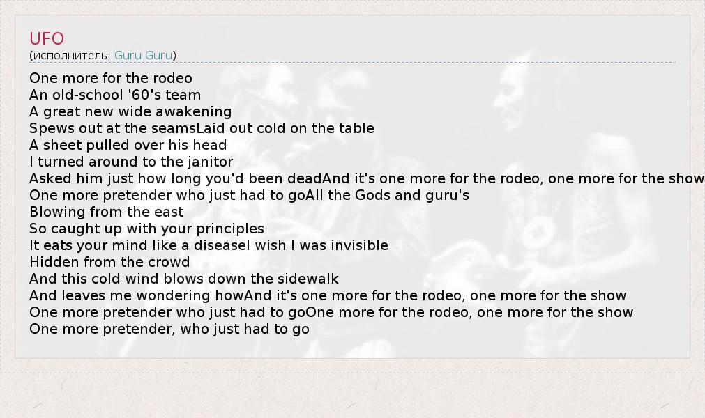 Это интересно:Guru Guru (Гуру Гуру) — один из наиболее значимых и успешных германских музыкальных коллективов, играющих краут-рок. Группа существует с конца 1960-х по сей день. Лидер — Мани Ноймайер.За почти 40 лет существования Guru Guru выпустили свыше 20 альбомов. Cумма проданных экземпляров всех релизов вместе взятых превышает 500 000. Группа отыграла множество концертов, появлялась в фильмах, на радио и телевидении.... продолжение
