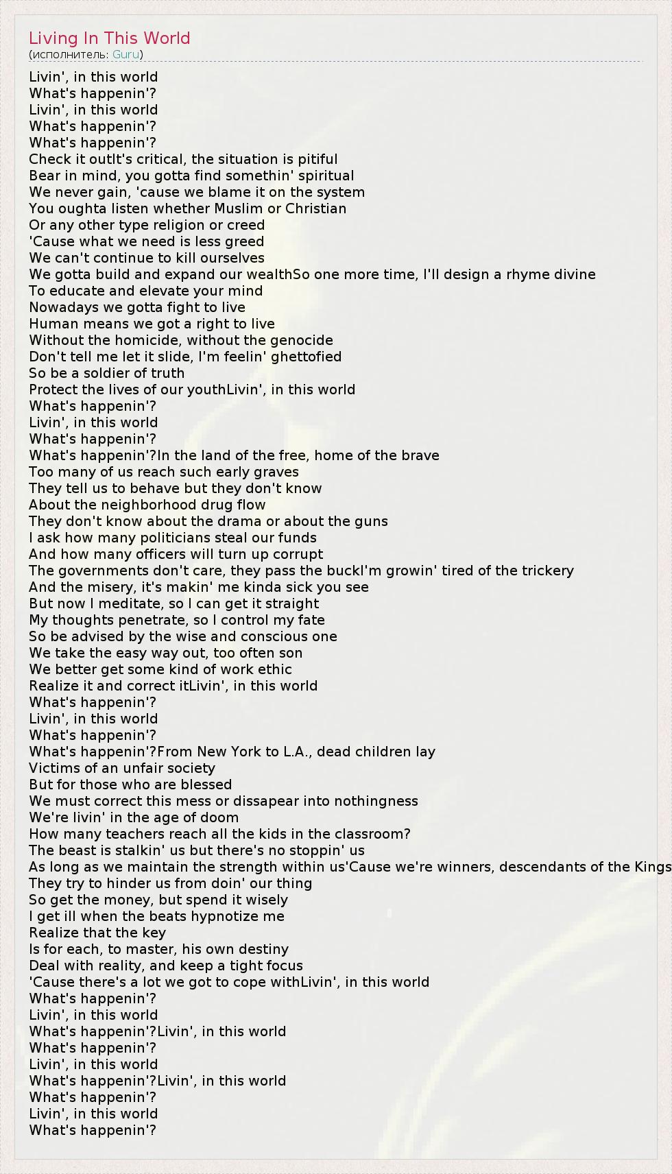 Это интересно:R.I.P. 19.04.2010Проект Guru's Jazzmatazz, где хип-хоп встречается с джазом, соулом и фанком, стартовал в 1993 году.Говорить о Jazzmatazz Vol. 1, пластинке вышедшей в 1993 году, как о сольнике Guru по меньшей мере банально, столь велик вклад приглашенных им музыкантов. По сути Guru сделал невозможное - доказал, что хип-хоп может быть не примитивным речитативом под бит ди-джея, но фантастически красивой музыкой.... продолжение