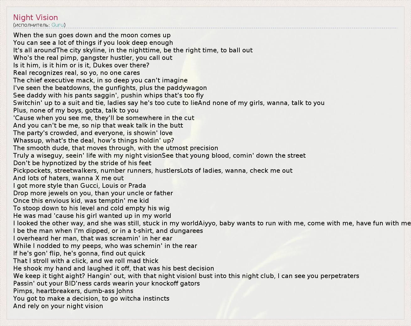Truly a wiseguy, seein' life with my night visionSee that young blood, comin' down the street