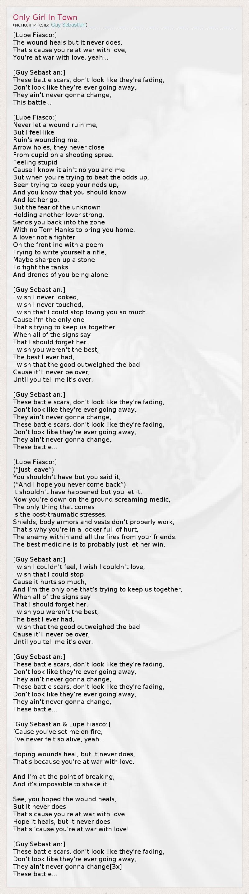 [Lupe Fiasco:] The wound heals but it never does, That's cause you're at war with love, You're at war with love, yeah... [Guy Sebastian:] These battle scars, don't look like they're fading, Don't look like they're ever going away, They ain't never gonna change, This battle... [Lupe Fiasco:] Never let a wound ruin me, But I feel like Ruin's wounding me. Arrow holes, they never close From cupid on a shooting spree. Feeling stupid Cause I know it ain't no you and me But when you're trying to beat the odds up, Been trying to keep your nods up, And you know that you should know And let her go. But the fear of the unknown Holding another lover strong, Sends you back into the zone With no Tom Hanks to bring you home. A lover not a fighter On the frontline with a poem Trying to write yourself a rifle, Maybe sharpen up a stone To fight the tanks And drones of you being alone. [Guy Sebastian:] I wish I never looked, I wish I never touched, I wish that I could stop loving you so much Cause I'm the only one That's trying to keep us together When all of the signs say That I should forget her. I wish you weren't the best, The best I ever had, I wish that the good outweighed the bad Cause it'll never be over, Until you tell me it's over. [Guy Sebastian:] These battle scars, don't look like they're fading, Don't look like they're ever going away, They ain't never gonna change, These battle scars, don't look like they're fading, Don't look like they're ever going away, They ain't never gonna change, These battle... [Lupe Fiasco:] (“Just leave”) You shouldn't have but you said it, (“And I hope you never come back”) It shouldn't have happened but you let it. Now you're down on the ground screaming medic, The only thing that comes Is the post-traumatic stresses. Shields, body armors and vests don't properly work, That's why you're in a locker full of hurt, The enemy within and all the fires from your friends. The best medicine is to probably just let her win. [Guy Sebastian:] I wish I couldn't feel, I wish I couldn't love, I wish that I could stop Cause it hurts so much, And I'm the only one that's trying to keep us together, When all of the signs say That I should forget her. I wish you weren't the best, The best I ever had, I wish that the good outweighed the bad Cause it'll never be over, Until you tell me it's over. [Guy Sebastian:] These battle scars, don't look like they're fading, Don't look like they're ever going away, They ain't never gonna change, These battle scars, don't look like they're fading, Don't look like they're ever going away, They ain't never gonna change, These battle... [Guy Sebastian & Lupe Fiasco:] ‘Cause you've set me on fire, I've never felt so alive, yeah... Hoping wounds heal, but it never does, That's because you're at war with love. And I'm at the point of breaking, And it's impossible to shake it. See, you hoped the wound heals, But it never does That's cause you're at war with love. Hope it heals, but it never does That's ‘cause you're at war with love! [Guy Sebastian:] These battle scars, don't look like they're fading, Don't look like they're ever going away, They ain't never gonna change[3x] These battle...
