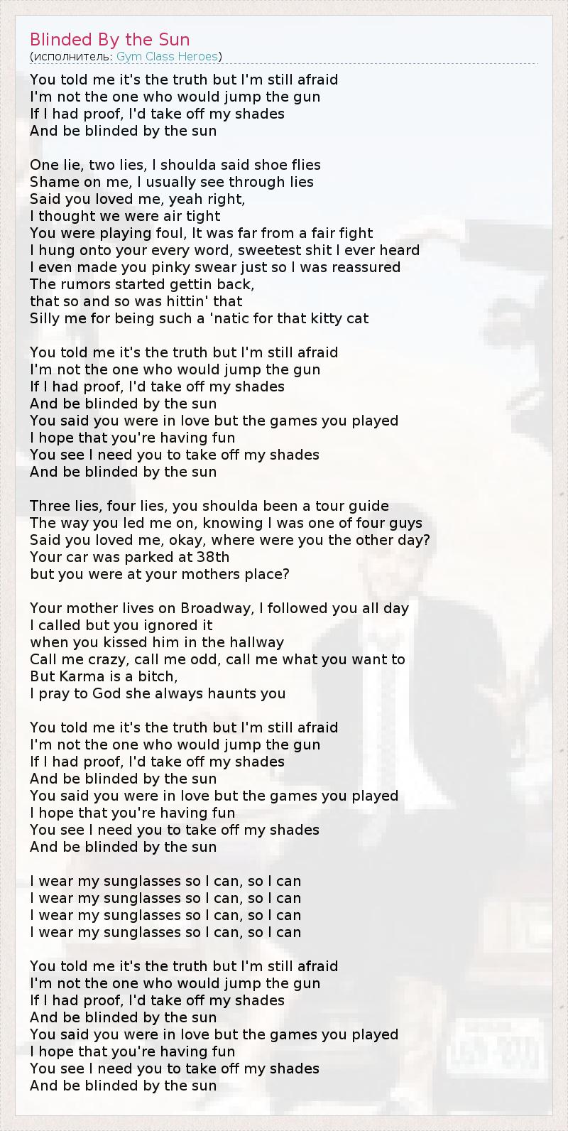 You told me it's the truth but I'm still afraid I'm not the one who would jump the gun If I had proof, I'd take off my shades And be blinded by the sun One lie, two lies, I shoulda said shoe flies Shame on me, I usually see through lies Said you loved me, yeah right, I thought we were air tight You were playing foul, It was far from a fair fight I hung onto your every word, sweetest shit I ever heard I even made you pinky swear just so I was reassured The rumors started gettin back, that so and so was hittin' that Silly me for being such a 'natic for that kitty cat You told me it's the truth but I'm still afraid I'm not the one who would jump the gun If I had proof, I'd take off my shades And be blinded by the sun You said you were in love but the games you played I hope that you're having fun You see I need you to take off my shades And be blinded by the sun Three lies, four lies, you shoulda been a tour guide The way you led me on, knowing I was one of four guys Said you loved me, okay, where were you the other day? Your car was parked at 38th but you were at your mothers place? Your mother lives on Broadway, I followed you all day I called but you ignored it when you kissed him in the hallway Call me crazy, call me odd, call me what you want to But Karma is a bitch, I pray to God she always haunts you You told me it's the truth but I'm still afraid I'm not the one who would jump the gun If I had proof, I'd take off my shades And be blinded by the sun You said you were in love but the games you played I hope that you're having fun You see I need you to take off my shades And be blinded by the sun I wear my sunglasses so I can, so I can I wear my sunglasses so I can, so I can I wear my sunglasses so I can, so I can I wear my sunglasses so I can, so I can You told me it's the truth but I'm still afraid I'm not the one who would jump the gun If I had proof, I'd take off my shades And be blinded by the sun You said you were in love but the games you played I hope that you're having fun You see I need you to take off my shades And be blinded by the sun