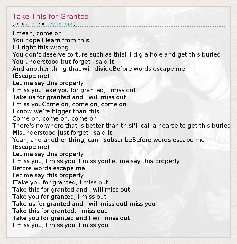 А как ты думаешь, о чем песня "Take This for Granted" ?