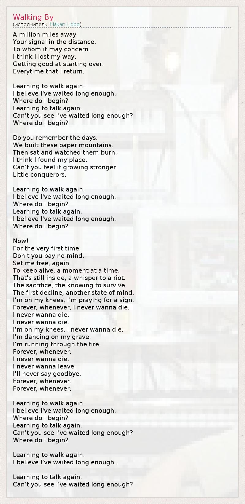 К миллиону миль отсюда, Вдалеке светит твой маяк Тому, кому он нужен. Кажется, я сбился с пути. У меня всё лучше получается начинать сначала С каждым возвращением. Я заново учусь ходить, Кажется, я достаточно долго ждал. С чего мне начать? Я заново учусь говорить. Разве ты не видишь, что я достаточно долго ждал? С чего мне начать? Ты помнишь те дни, Когда мы строили эти бумажные горы, А потом сидели и смотрели, как они горят. Кажется, я нашел свою боль. Разве ты не чувствуешь, что она становится сильнее? Маленький завоеватель... Я заново учусь ходить, Кажется, я достаточно долго ждал. С чего мне начать? Я заново учусь говорить. Кажется, я достаточно долго ждал. С чего мне начать? А сейчас, В самый первый раз, Не обращай внимания, В который раз освободи меня... Чтобы сохранить тот миг, Что всё ещё внутри, шёпот, призывающий к восстанию, Жертва, умение выжить, Первый спад - другое настроение. Я на коленях, я молю о знаке... Никогда, ни за что я не хочу умирать... Я не хочу умирать, Я не хочу умирать... Я на коленях, я не хочу умереть никогда. Я танцую на своей могиле, Я бегу сквозь пламя, Никогда, ни за что Я не хочу умирать, Я не хочу уходить, Я никогда не скажу "Прощай!" Никогда, ни за что... Никогда, ни за что... Я заново учусь ходить, Кажется, я достаточно долго ждал. С чего мне начать? Я заново учусь говорить. Разве ты не видишь, что я достаточно долго ждал? С чего мне начать? Я заново учусь ходить, Кажется, я достаточно долго ждал... Я заново учусь говорить. Разве ты не видишь, что я достаточно долго ждал?