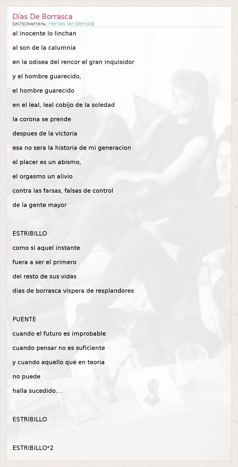 al inocente lo linchan al son de la calumnia en la odisea del rencor el gran inquisidor y el hombre guarecido, el hombre guarecido en el leal, leal cobijo de la soledad la corona se prende despues de la victoria esa no sera la historia de mi generacion el placer es un abismo, el orgasmo un alivio contra las farsas, falsas de control de la gente mayor ESTRIBILLO como si aquel instante fuera a ser el primero del resto de sus vidas dias de borrasca vispera de resplandores PUENTE cuando el futuro es improbable cuando pensar no es suficiente y cuando aquello que en teoria no puede halla sucedido.... ESTRIBILLO ESTRIBILLO*2