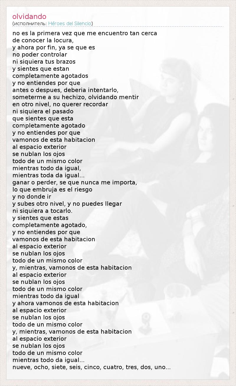 no es la primera vez que me encuentro tan cerca de conocer la locura, y ahora por fin, ya se que es no poder controlar ni siquiera tus brazos y sientes que estan completamente agotados y no entiendes por que antes o despues, deberia intentarlo, someterme a su hechizo, olvidando mentir en otro nivel, no querer recordar ni siquiera el pasado que sientes que esta completamente agotado y no entiendes por que vamonos de esta habitacion al espacio exterior se nublan los ojos todo de un mismo color mientras todo da igual, mientras toda da igual... ganar o perder, se que nunca me importa, lo que embruja es el riesgo y no donde ir y subes otro nivel, y no puedes llegar ni siquiera a tocarlo. y sientes que estas completamente agotado, y no entiendes por que vamonos de esta habitacion al espacio exterior se nublan los ojos todo de un mismo color y, mientras, vamonos de esta habitacion al espacio exterior se nublan los ojos todo de un mismo color mientras todo da igual y ahora vamonos de esta habitacion al espacio exterior se nublan los ojos todo de un mismo color y, mientras, vamonos de esta habitacion al espacio exterior se nublan los ojos todo de un mismo color mientras todo da igual... nueve, ocho, siete, seis, cinco, cuatro, tres, dos, uno...