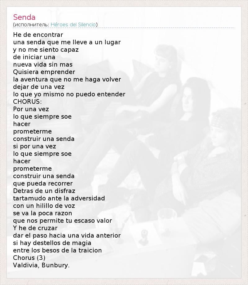 He de encontrar una senda que me lleve a un lugar y no me siento capaz de iniciar una nueva vida sin mas Quisiera emprender la aventura que no me haga volver dejar de una vez lo que yo mismo no puedo entender CHORUS: Por una vez lo que siempre soe hacer prometerme construir una senda si por una vez lo que siempre soe hacer prometerme construir una senda que pueda recorrer Detras de un disfraz tartamudo ante la adversidad con un hilillo de voz se va la poca razon que nos permite tu escaso valor Y he de cruzar dar el paso hacia una vida anterior si hay destellos de magia entre los besos de la traicion Chorus (3) Valdivia, Bunbury.