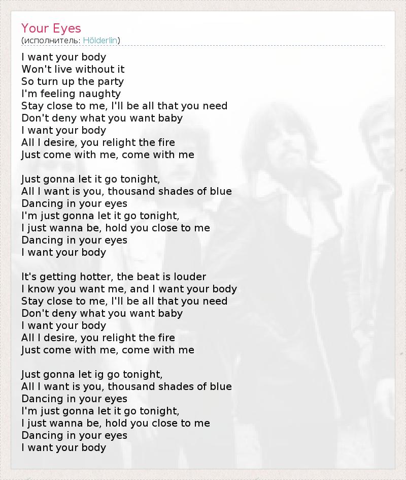 I want your body Won't live without it So turn up the party I'm feeling naughty Stay close to me, I'll be all that you need Don't deny what you want baby I want your body All I desire, you relight the fire Just come with me, come with me Just gonna let it go tonight, All I want is you, thousand shades of blue Dancing in your eyes I'm just gonna let it go tonight, I just wanna be, hold you close to me Dancing in your eyes I want your body It's getting hotter, the beat is louder I know you want me, and I want your body Stay close to me, I'll be all that you need Don't deny what you want baby I want your body All I desire, you relight the fire Just come with me, come with me Just gonna let ig go tonight, All I want is you, thousand shades of blue Dancing in your eyes I'm just gonna let it go tonight, I just wanna be, hold you close to me Dancing in your eyes I want your body