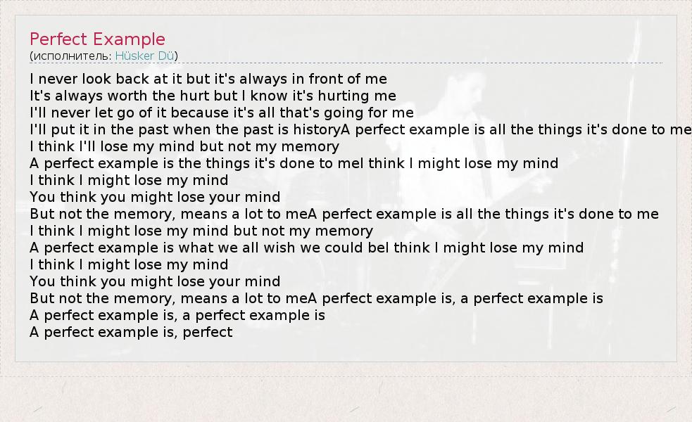 I never look back at it but it's always in front of me It's always worth the hurt but I know it's hurting me I'll never let go of it because it's all that's going for me I'll put it in the past when the past is historyA perfect example is all the things it's done to me I think I'll lose my mind but not my memory A perfect example is the things it's done to meI think I might lose my mind I think I might lose my mind You think you might lose your mind But not the memory, means a lot to meA perfect example is all the things it's done to me I think I might lose my mind but not my memory A perfect example is what we all wish we could beI think I might lose my mind I think I might lose my mind You think you might lose your mind But not the memory, means a lot to meA perfect example is, a perfect example is A perfect example is, a perfect example is A perfect example is, perfect