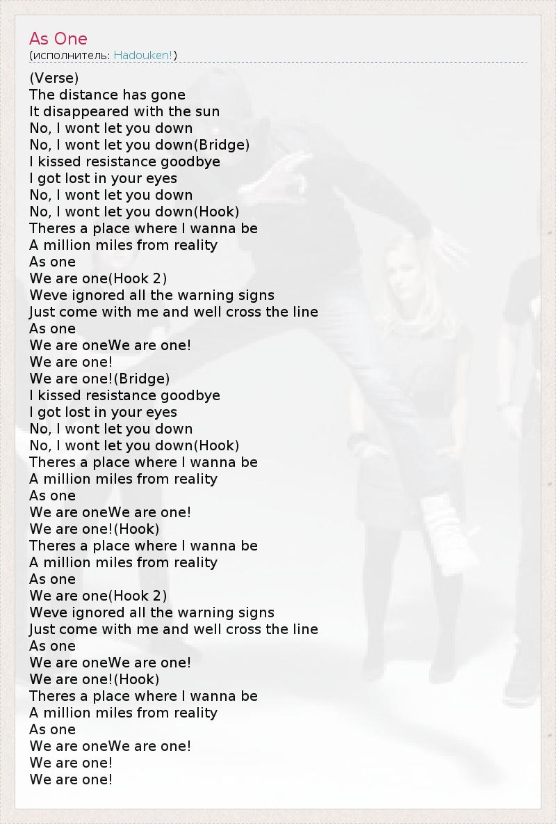 (Verse) The distance has gone It disappeared with the sun No, I wont let you down No, I wont let you down(Bridge) I kissed resistance goodbye I got lost in your eyes No, I wont let you down No, I wont let you down(Hook) Theres a place where I wanna be A million miles from reality As one We are one(Hook 2) Weve ignored all the warning signs Just come with me and well cross the line As one We are oneWe are one! We are one! We are one!(Bridge) I kissed resistance goodbye I got lost in your eyes No, I wont let you down No, I wont let you down(Hook) Theres a place where I wanna be A million miles from reality As one We are oneWe are one! We are one!(Hook) Theres a place where I wanna be A million miles from reality As one We are one(Hook 2) Weve ignored all the warning signs Just come with me and well cross the line As one We are oneWe are one! We are one!(Hook) Theres a place where I wanna be A million miles from reality As one We are oneWe are one! We are one! We are one!