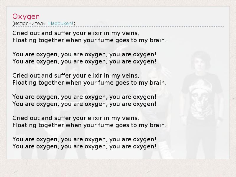 Я вскрикнул и пустил твой эликсир по венам. Мы вместе улетаем, пока твои пары проникают в мой мозг. Ты кислород, ты кислород, ты кислород! Ты кислород, ты кислород, ты кислород! Я вскрикнул и пустил твой эликсир по венам. Мы вместе улетаем, пока твои пары проникают в мой мозг. Ты кислород, ты кислород, ты кислород! Ты кислород, ты кислород, ты кислород! Я вскрикнул и пустил твой эликсир по венам. Мы вместе улетаем, пока твои пары проникают в мой мозг. Ты кислород, ты кислород, ты кислород! Ты кислород, ты кислород, ты кислород!