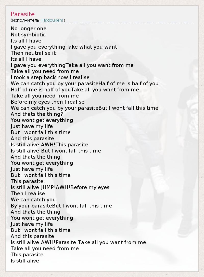 No longer one Not symbiotic Its all I have I gave you everythingTake what you want Then neutralise it Its all I have I gave you everythingTake all you want from me Take all you need from me I took a step back now I realise We can catch you by your parasiteHalf of me is half of you Half of me is half of youTake all you want from me Take all you need from me Before my eyes then I realise We can catch you by your parasiteBut I wont fall this time And thats the thing? You wont get everything Just have my life But I wont fall this time And this parasite Is still alive!AWH!This parasite Is still alive!But I wont fall this time And thats the thing You wont get everything Just have my life But I wont fall this time This parasite Is still alive!JUMP!AWH!Before my eyes Then I realise We can catch you By your parasiteBut I wont fall this time And thats the thing You wont get everything Just have my life But I wont fall this time And this parasite Is still alive!AWH!Parasite!Take all you want from me Take all you need from me This parasite Is still alive!