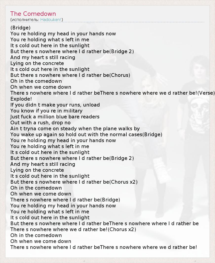 (Bridge) You re holding my head in your hands now You re holding what s left in me It s cold out here in the sunlight But there s nowhere where I d rather be(Bridge 2) And my heart s still racing Lying on the concrete It s cold out here in the sunlight But there s nowhere where I d rather be(Chorus) Oh in the comedown Oh when we come down There s nowhere where I d rather beThere s nowhere where we d rather be!(Verse) Explode! If you didn t make your runs, unload You know if you re in military Just fuck a million blue bare readers Out with a rush, drop no Ain t tryna come on steady when the plane walks by You wake up again so hold out with the normal cases(Bridge) You re holding my head in your hands now You re holding what s left in me It s cold out here in the sunlight But there s nowhere where I d rather be(Bridge 2) And my heart s still racing Lying on the concrete It s cold out here in the sunlight But there s nowhere where I d rather be(Chorus x2) Oh in the comedown Oh when we come down There s nowhere where I d rather be(Bridge) You re holding my head in your hands now You re holding what s left in me It s cold out here in the sunlight But there s nowhere where I d rather beThere s nowhere where I d rather be There s nowhere where we d rather be!(Chorus x2) Oh in the comedown Oh when we come down There s nowhere where I d rather beThere s nowhere where we d rather be!