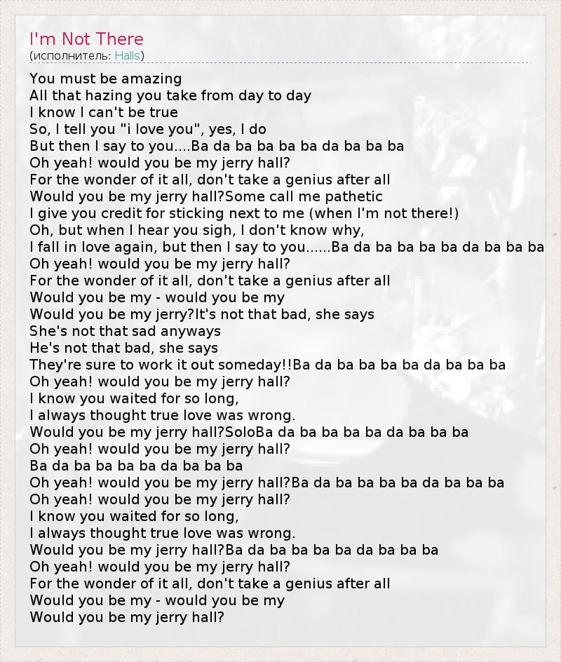 You must be amazing All that hazing you take from day to day I know I can't be true So, I tell you "i love you", yes, I do But then I say to you....Ba da ba ba ba ba da ba ba ba Oh yeah! would you be my jerry hall? For the wonder of it all, don't take a genius after all Would you be my jerry hall?Some call me pathetic I give you credit for sticking next to me (when I'm not there!) Oh, but when I hear you sigh, I don't know why, I fall in love again, but then I say to you......Ba da ba ba ba ba da ba ba ba Oh yeah! would you be my jerry hall? For the wonder of it all, don't take a genius after all Would you be my - would you be my Would you be my jerry?It's not that bad, she says She's not that sad anyways He's not that bad, she says They're sure to work it out someday!!Ba da ba ba ba ba da ba ba ba Oh yeah! would you be my jerry hall? I know you waited for so long, I always thought true love was wrong. Would you be my jerry hall?SoloBa da ba ba ba ba da ba ba ba Oh yeah! would you be my jerry hall? Ba da ba ba ba ba da ba ba ba Oh yeah! would you be my jerry hall?Ba da ba ba ba ba da ba ba ba Oh yeah! would you be my jerry hall? I know you waited for so long, I always thought true love was wrong. Would you be my jerry hall?Ba da ba ba ba ba da ba ba ba Oh yeah! would you be my jerry hall? For the wonder of it all, don't take a genius after all Would you be my - would you be my Would you be my jerry hall?