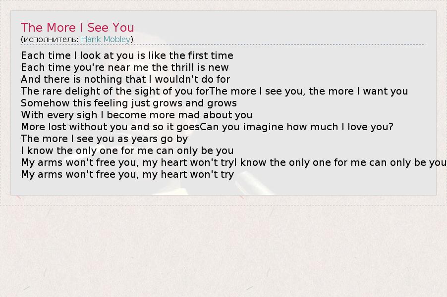 Each time I look at you is like the first time Each time you're near me the thrill is new And there is nothing that I wouldn't do for The rare delight of the sight of you forThe more I see you, the more I want you Somehow this feeling just grows and grows With every sigh I become more mad about you More lost without you and so it goesCan you imagine how much I love you? The more I see you as years go by I know the only one for me can only be you My arms won't free you, my heart won't tryI know the only one for me can only be you My arms won't free you, my heart won't try