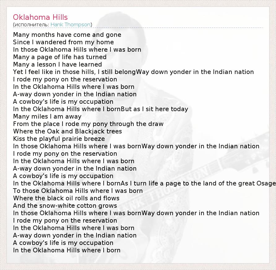 In those Oklahoma Hills where I was bornWay down yonder in the Indian nation