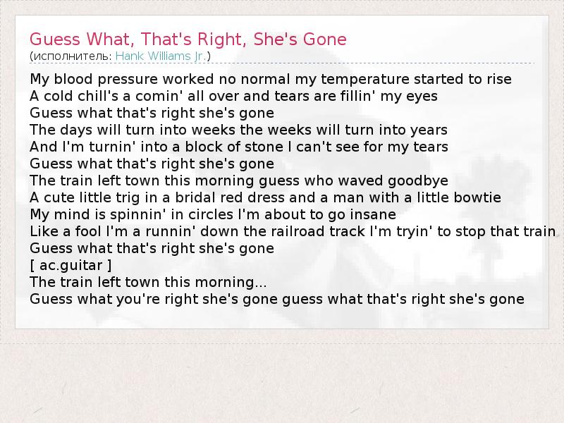 А как ты думаешь, о чем песня "Guess What, That's Right, She's Gone" ?