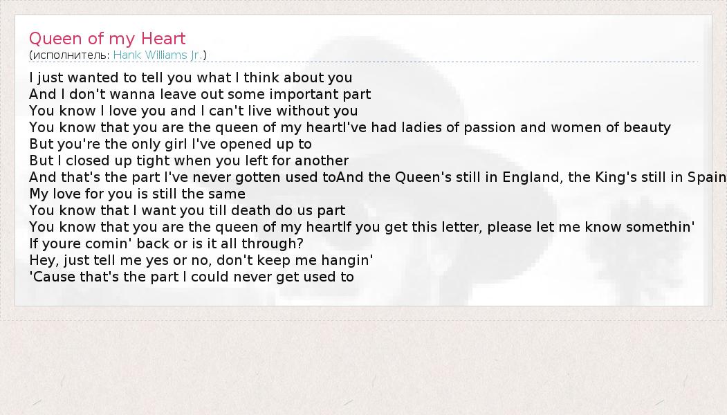 I just wanted to tell you what I think about you And I don't wanna leave out some important part You know I love you and I can't live without you You know that you are the queen of my heartI've had ladies of passion and women of beauty But you're the only girl I've opened up to But I closed up tight when you left for another And that's the part I've never gotten used toAnd the Queen's still in England, the King's still in Spain My love for you is still the same You know that I want you till death do us part You know that you are the queen of my heartIf you get this letter, please let me know somethin' If youre comin' back or is it all through? Hey, just tell me yes or no, don't keep me hangin' 'Cause that's the part I could never get used to