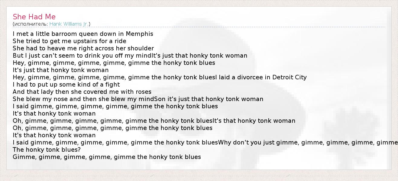 I said gimme, gimme, gimme, gimme, gimme the honky tonk bluesWhy don't you just gimme, gimme, gimme, gimme, gimme