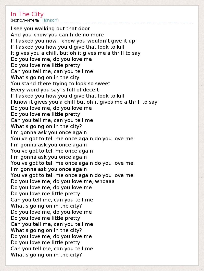 I see you walking out that door And you know you can hide no more If I asked you now I know you wouldn't give it up If I asked you how you'd give that look to kill It gives you a chill, but oh it gives me a thrill to say Do you love me, do you love me Do you love me little pretty Can you tell me, can you tell me What's going on in the city You stand there trying to look so sweet Every word you say is full of deceit If I asked you how you'd give that look to kill I know it gives you a chill but oh it gives me a thrill to say Do you love me, do you love me Do you love me little pretty Can you tell me, can you tell me What's going on in the city? I'm gonna ask you once again You've got to tell me once again do you love me I'm gonna ask you once again You've got to tell me once again I'm gonna ask you once again You've got to tell me once again do you love me I'm gonna ask you once again You've got to tell me once again do you love me Do you love me, do you love me, whoaaa Do you love me, do you love me Do you love me little pretty Can you tell me, can you tell me What's going on in the city? Do you love me, do you love me Do you love me little pretty Can you tell me, can you tell me What's going on in the city? Do you love me, do you love me Do you love me little pretty Can you tell me, can you tell me What's going on in the city?