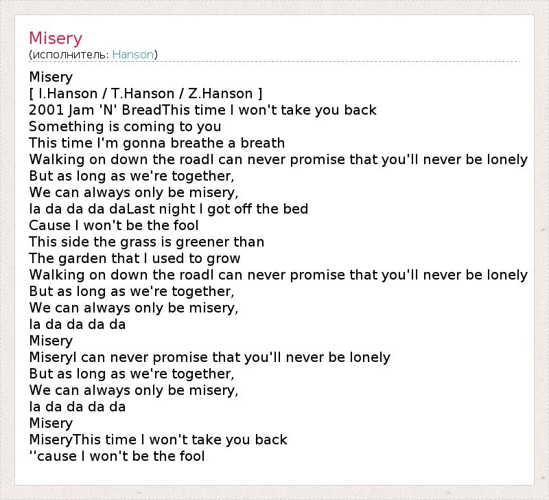 Misery [ I.Hanson / T.Hanson / Z.Hanson ] 2001 Jam 'N' BreadThis time I won't take you back Something is coming to you This time I'm gonna breathe a breath Walking on down the roadI can never promise that you'll never be lonely But as long as we're together, We can always only be misery, la da da da daLast night I got off the bed Cause I won't be the fool This side the grass is greener than The garden that I used to grow Walking on down the roadI can never promise that you'll never be lonely But as long as we're together, We can always only be misery, la da da da da Misery MiseryI can never promise that you'll never be lonely But as long as we're together, We can always only be misery, la da da da da Misery MiseryThis time I won't take you back ''cause I won't be the fool