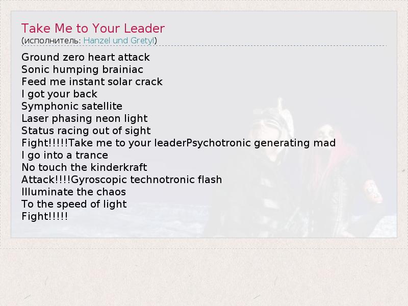 А как ты думаешь, о чем песня "Take Me to Your Leader" ?