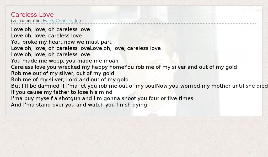 Love oh, love, oh careless love Love oh, love, careless love You broke my heart now we must part Love oh, love, oh careless loveLove oh, love, careless love Love oh, love, oh careless love You made me weep, you made me moan Careless love you wrecked my happy homeYou rob me of my silver and out of my gold Rob me out of my silver, out of my gold Rob me of my silver, Lord and out of my gold But I'll be damned if I'ma let you rob me out of my soulNow you worried my mother until she died If you cause my father to lose his mind I'ma buy myself a shotgun and I'm gonna shoot you four or five times And I'ma stand over you and watch you finish dying