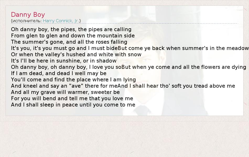 Oh danny boy, oh danny boy, I love you soBut when ye come and all the flowers are dying
