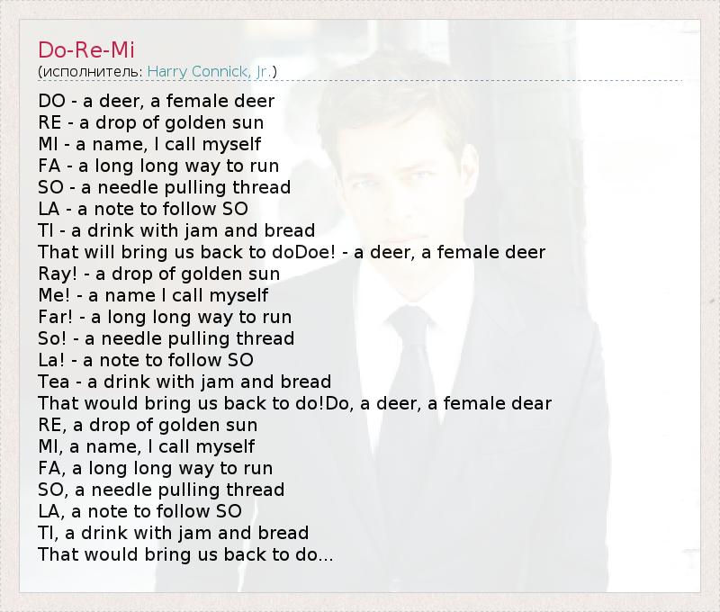 DO - a deer, a female deer RE - a drop of golden sun MI - a name, I call myself FA - a long long way to run SO - a needle pulling thread LA - a note to follow SO TI - a drink with jam and bread That will bring us back to doDoe! - a deer, a female deer Ray! - a drop of golden sun Me! - a name I call myself Far! - a long long way to run So! - a needle pulling thread La! - a note to follow SO Tea - a drink with jam and bread That would bring us back to do!Do, a deer, a female dear RE, a drop of golden sun MI, a name, I call myself FA, a long long way to run SO, a needle pulling thread LA, a note to follow SO TI, a drink with jam and bread That would bring us back to do...