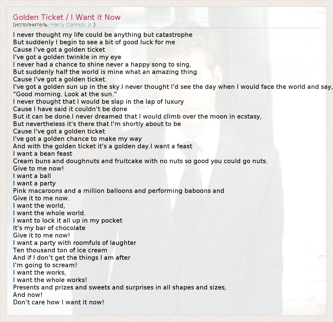 I never thought my life could be anything but catastrophe But suddenly I begin to see a bit of good luck for me Cause I've got a golden ticket I've got a golden twinkle in my eye I never had a chance to shine never a happy song to sing, But suddenly half the world is mine what an amazing thing Cause I've got a golden ticket. I've got a golden sun up in the sky.I never thought I'd see the day when I would face the world and say, "Good morning. Look at the sun." I never thought that I would be slap in the lap of luxury Cause I have said it couldn't be done But it can be done.I never dreamed that I would climb over the moon in ecstasy, But nevertheless it's there that I'm shortly about to be Cause I've got a golden ticket I've got a golden chance to make my way And with the golden ticket it's a golden day.I want a feast I want a bean feast Cream buns and doughnuts and fruitcake with no nuts so good you could go nuts. Give to me now! I want a ball I want a party Pink macaroons and a million balloons and performing baboons and Give it to me now. I want the world, I want the whole world. I want to lock it all up in my pocket It's my bar of chocolate Give it to me now! I want a party with roomfuls of laughter Ten thousand ton of ice cream And if I don't get the things I am after I'm going to scream! I want the works, I want the whole works! Presents and prizes and sweets and surprises in all shapes and sizes, And now! Don't care how I want it now!