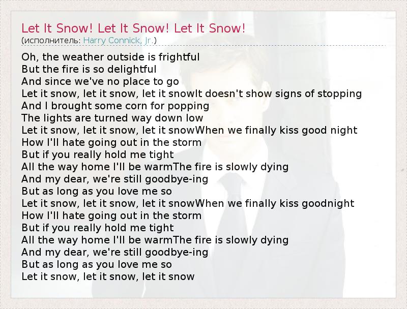 Oh, the weather outside is frightful But the fire is so delightful And since we've no place to go Let it snow, let it snow, let it snowIt doesn't show signs of stopping And I brought some corn for popping The lights are turned way down low Let it snow, let it snow, let it snowWhen we finally kiss good night How I'll hate going out in the storm But if you really hold me tight All the way home I'll be warmThe fire is slowly dying And my dear, we're still goodbye-ing But as long as you love me so Let it snow, let it snow, let it snowWhen we finally kiss goodnight How I'll hate going out in the storm But if you really hold me tight All the way home I'll be warmThe fire is slowly dying And my dear, we're still goodbye-ing But as long as you love me so Let it snow, let it snow, let it snow