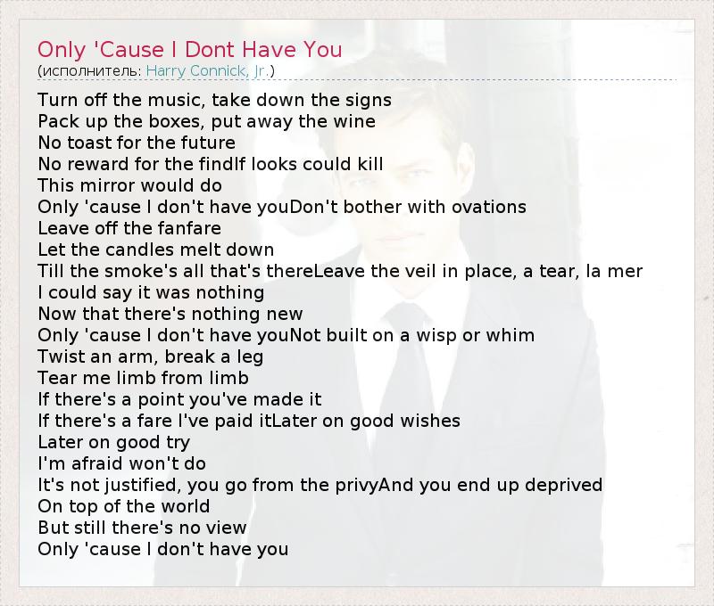 Turn off the music, take down the signs Pack up the boxes, put away the wine No toast for the future No reward for the findIf looks could kill This mirror would do Only 'cause I don't have youDon't bother with ovations Leave off the fanfare Let the candles melt down Till the smoke's all that's thereLeave the veil in place, a tear, la mer I could say it was nothing Now that there's nothing new Only 'cause I don't have youNot built on a wisp or whim Twist an arm, break a leg Tear me limb from limb If there's a point you've made it If there's a fare I've paid itLater on good wishes Later on good try I'm afraid won't do It's not justified, you go from the privyAnd you end up deprived On top of the world But still there's no view Only 'cause I don't have you