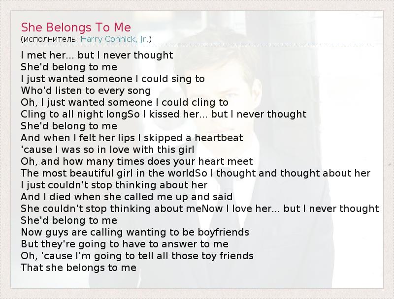 I met her... but I never thought She'd belong to me I just wanted someone I could sing to Who'd listen to every song Oh, I just wanted someone I could cling to Cling to all night longSo I kissed her... but I never thought She'd belong to me And when I felt her lips I skipped a heartbeat 'cause I was so in love with this girl Oh, and how many times does your heart meet The most beautiful girl in the worldSo I thought and thought about her I just couldn't stop thinking about her And I died when she called me up and said She couldn't stop thinking about meNow I love her... but I never thought She'd belong to me Now guys are calling wanting to be boyfriends But they're going to have to answer to me Oh, 'cause I'm going to tell all those toy friends That she belongs to me