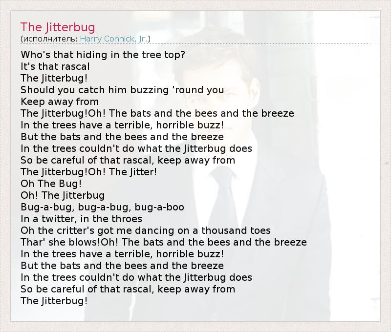 Who's that hiding in the tree top? It's that rascal The Jitterbug! Should you catch him buzzing 'round you Keep away from The Jitterbug!Oh! The bats and the bees and the breeze In the trees have a terrible, horrible buzz! But the bats and the bees and the breeze In the trees couldn't do what the Jitterbug does So be careful of that rascal, keep away from The Jitterbug!Oh! The Jitter! Oh The Bug! Oh! The Jitterbug Bug-a-bug, bug-a-bug, bug-a-boo In a twitter, in the throes Oh the critter's got me dancing on a thousand toes Thar' she blows!Oh! The bats and the bees and the breeze In the trees have a terrible, horrible buzz! But the bats and the bees and the breeze In the trees couldn't do what the Jitterbug does So be careful of that rascal, keep away from The Jitterbug!