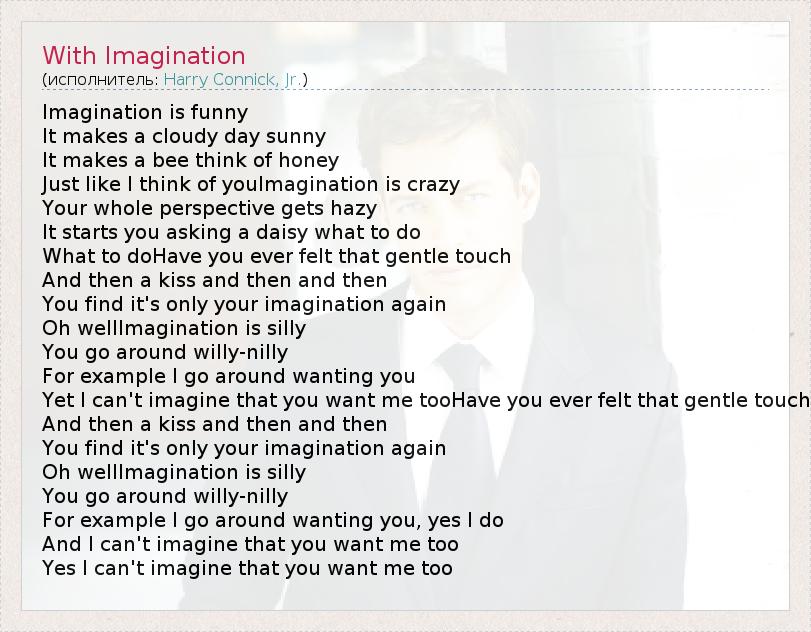 Imagination is funny It makes a cloudy day sunny It makes a bee think of honey Just like I think of youImagination is crazy Your whole perspective gets hazy It starts you asking a daisy what to do What to doHave you ever felt that gentle touch And then a kiss and then and then You find it's only your imagination again Oh wellImagination is silly You go around willy-nilly For example I go around wanting you Yet I can't imagine that you want me tooHave you ever felt that gentle touch And then a kiss and then and then You find it's only your imagination again Oh wellImagination is silly You go around willy-nilly For example I go around wanting you, yes I do And I can't imagine that you want me too Yes I can't imagine that you want me too