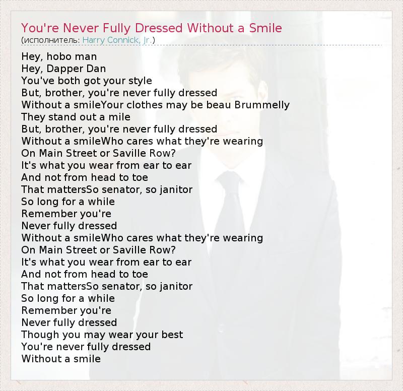 Hey, hobo man Hey, Dapper Dan You've both got your style But, brother, you're never fully dressed Without a smileYour clothes may be beau Brummelly They stand out a mile But, brother, you're never fully dressed Without a smileWho cares what they're wearing On Main Street or Saville Row? It's what you wear from ear to ear And not from head to toe That mattersSo senator, so janitor So long for a while Remember you're Never fully dressed Without a smileWho cares what they're wearing On Main Street or Saville Row? It's what you wear from ear to ear And not from head to toe That mattersSo senator, so janitor So long for a while Remember you're Never fully dressed Though you may wear your best You're never fully dressed Without a smile