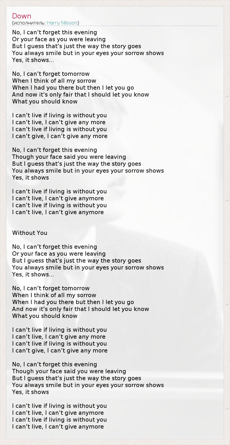 No, I can't forget this evening Or your face as you were leaving But I guess that's just the way the story goes You always smile but in your eyes your sorrow shows Yes, it shows... No, I can't forget tomorrow When I think of all my sorrow When I had you there but then I let you go And now it's only fair that I should let you know What you should know I can't live if living is without you I can't live, I can't give any more I can't live if living is without you I can't give, I can't give any more No, I can't forget this evening Though your face said you were leaving But I guess that's just the way the story goes You always smile but in your eyes your sorrow shows Yes, it shows I can't live if living is without you I can't live, I can't give anymore I can't live if living is without you I can't live, I can't give anymore Without You No, I can't forget this evening Or your face as you were leaving But I guess that's just the way the story goes You always smile but in your eyes your sorrow shows Yes, it shows... No, I can't forget tomorrow When I think of all my sorrow When I had you there but then I let you go And now it's only fair that I should let you know What you should know I can't live if living is without you I can't live, I can't give any more I can't live if living is without you I can't give, I can't give any more No, I can't forget this evening Though your face said you were leaving But I guess that's just the way the story goes You always smile but in your eyes your sorrow shows Yes, it shows I can't live if living is without you I can't live, I can't give anymore I can't live if living is without you I can't live, I can't give anymore